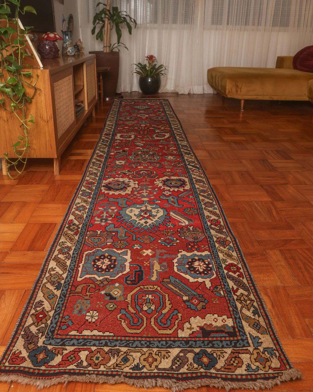 Com quase quatro metros de comprimento, esta passadeira é ideal para corredores amplos ou áreas de circulação que mereçam um toque de cor. Além de embelezar, ela conduz o olhar e traz uma sensação de continuidade e acolhimento ao ambiente.