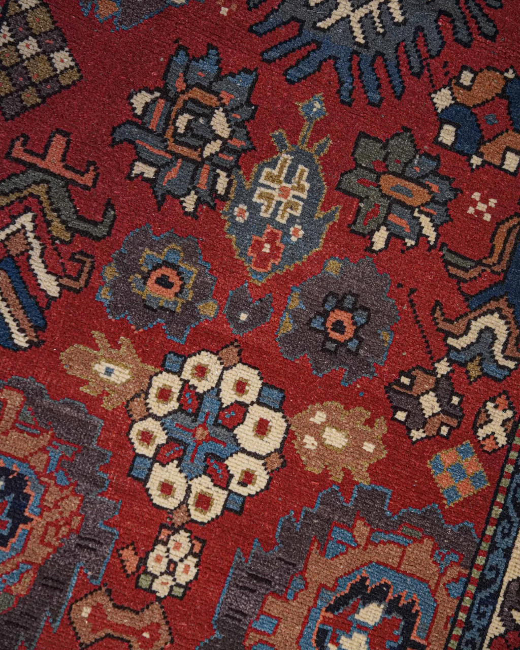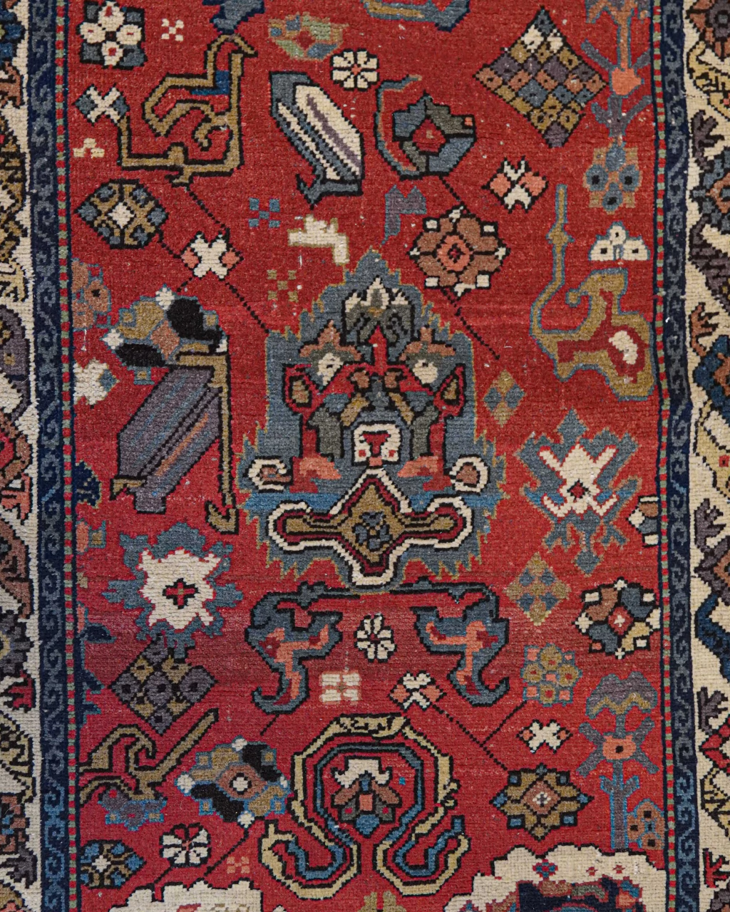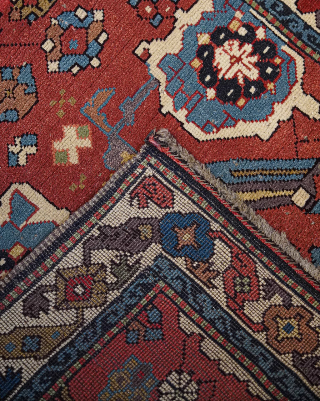 A paleta de cores detalhes em azul acinzentado, fendi, creme, ferrugem e verde-musgo que trazem delicadeza e elegância para o fundo vermelho com abrash. Os abrashs, caracterizados por variações sutis e inesperadas de cor, resultam do processo de tingimento manual com pigmentos naturais. Essa característica única não apenas valoriza a peça, mas também serve como uma assinatura artística do tecelão, conferindo autenticidade e charme à obra.