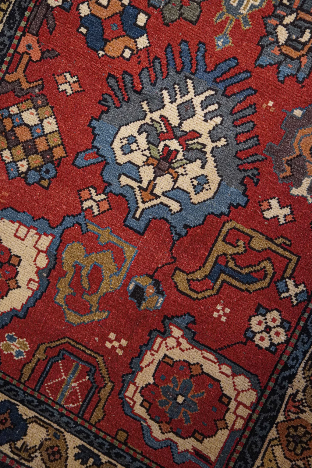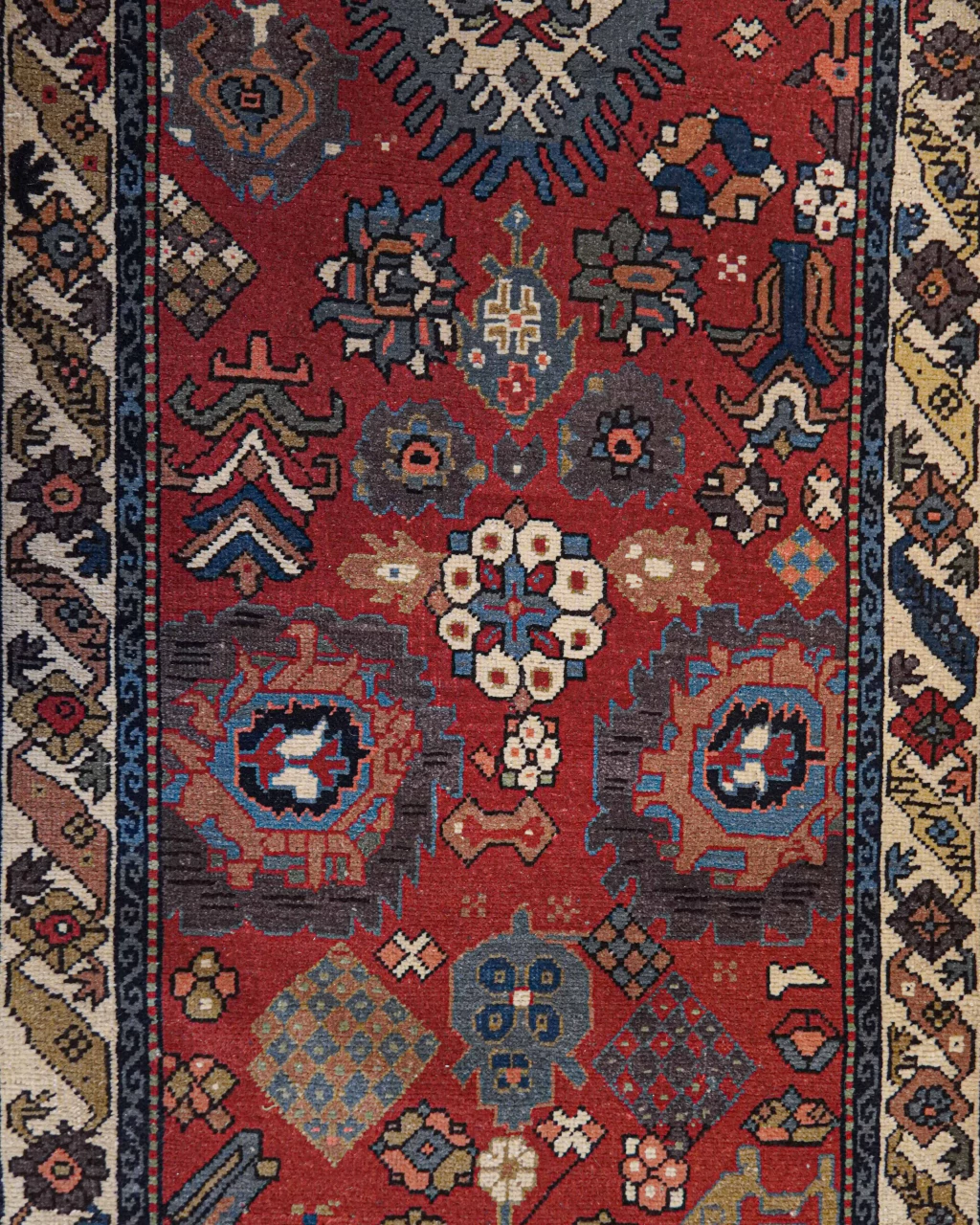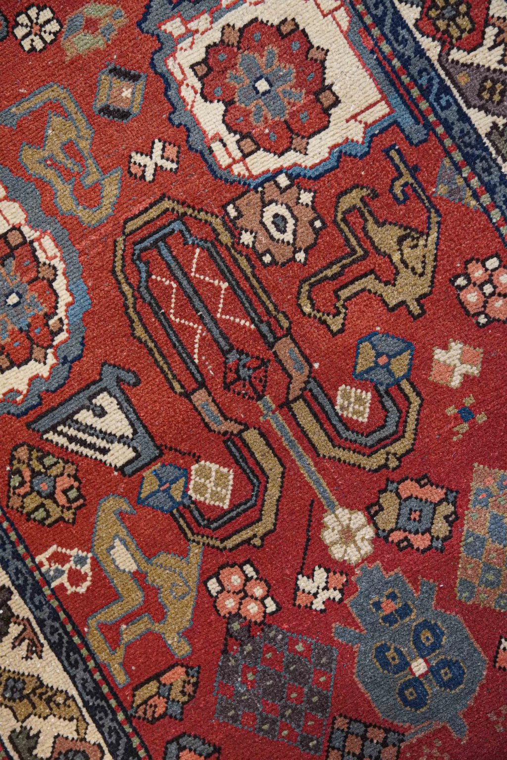 A paleta de cores detalhes em azul acinzentado, fendi, creme, ferrugem e verde-musgo que trazem delicadeza e elegância para o fundo vermelho com abrash. Os abrashs, caracterizados por variações sutis e inesperadas de cor, resultam do processo de tingimento manual com pigmentos naturais. Essa característica única não apenas valoriza a peça, mas também serve como uma assinatura artística do tecelão, conferindo autenticidade e charme à obra.
