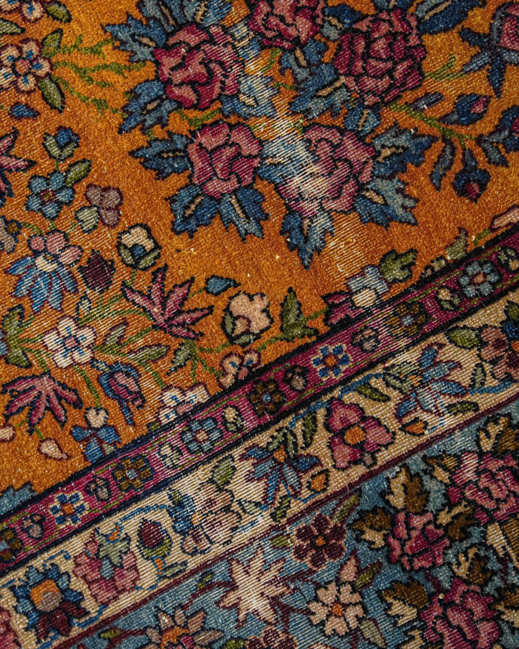 A pelagem exibe áreas em rapé, resultado natural do desgaste provocado por cerca de um século de uso. Esse aspecto confere ao tapete uma textura única e um charme atemporal, tão valorizado pelos colecionadores. No universo dos tapetes orientais, a passagem do tempo é um fator de distinção: entre 30 e 99 anos um tapete é considerado vintage; ao alcançar os 100 anos, entra na categoria dos antigos. Quanto mais velhos, mais desejados eles se tornam, tanto pela raridade quanto pela beleza que o tempo imprime em cada detalhe, transformando cada peça em um exemplar único.