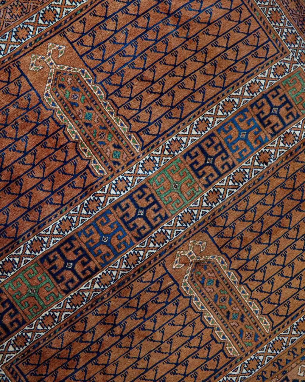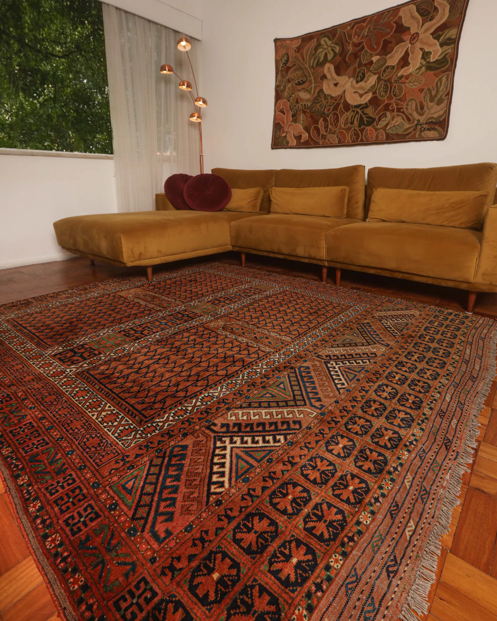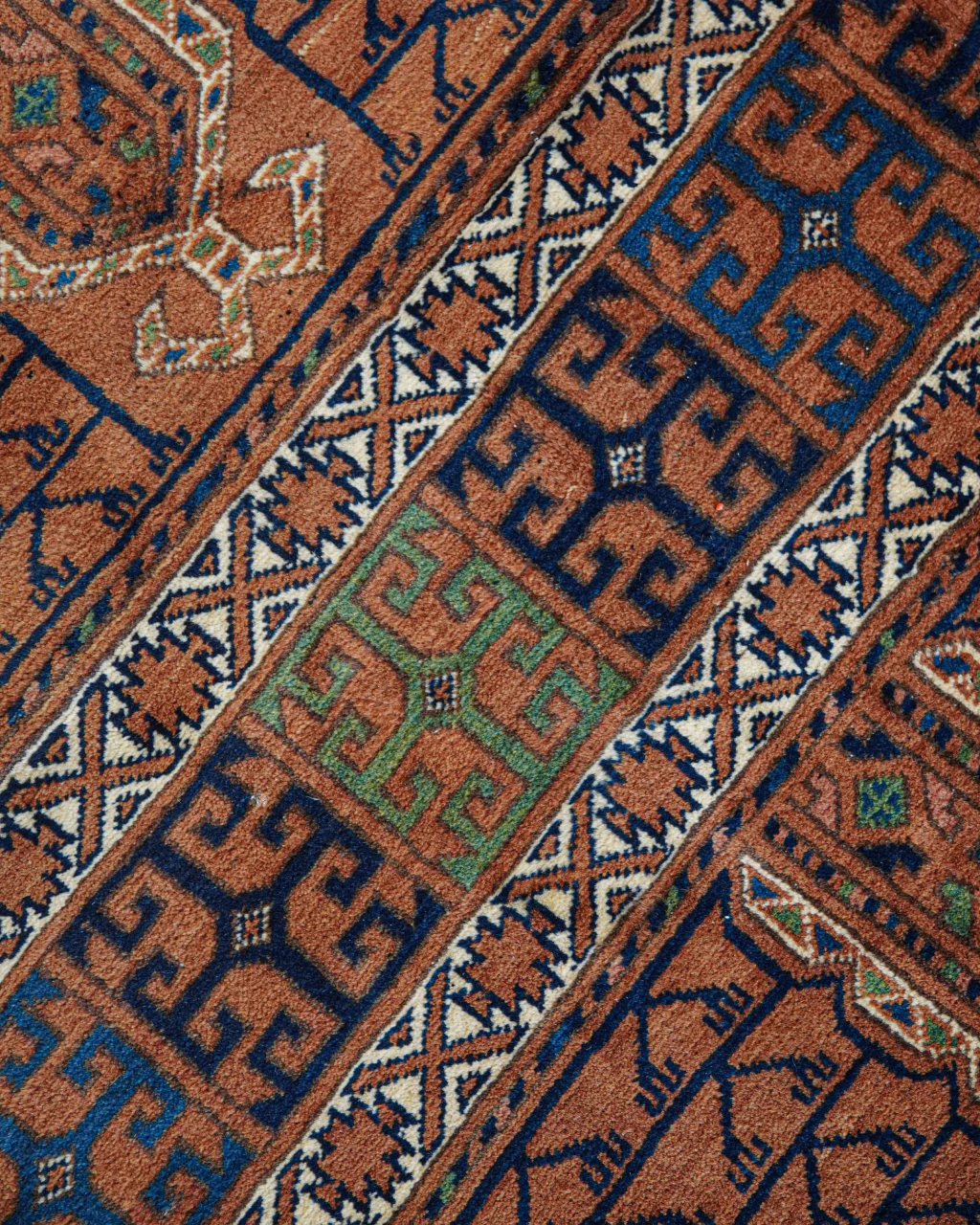A padronagem deste exemplar é típica dos Yomus. O campo é dividido em painéis decorados por motivos que remetem a símbolos de proteção, prosperidade e boa sorte, desenhos que, na tradição turcomena, eram usados tanto para decorar quanto para “guardar” a vida cotidiana da tribo. Trata-se de um design tribal de forte identidade, facilmente reconhecido por colecionadores e apreciadores.