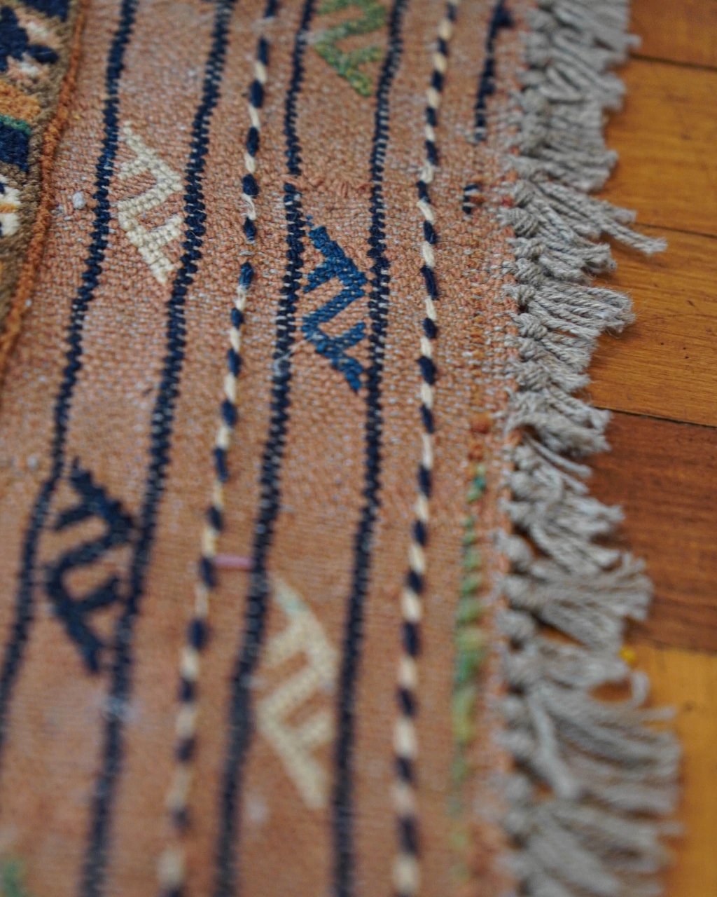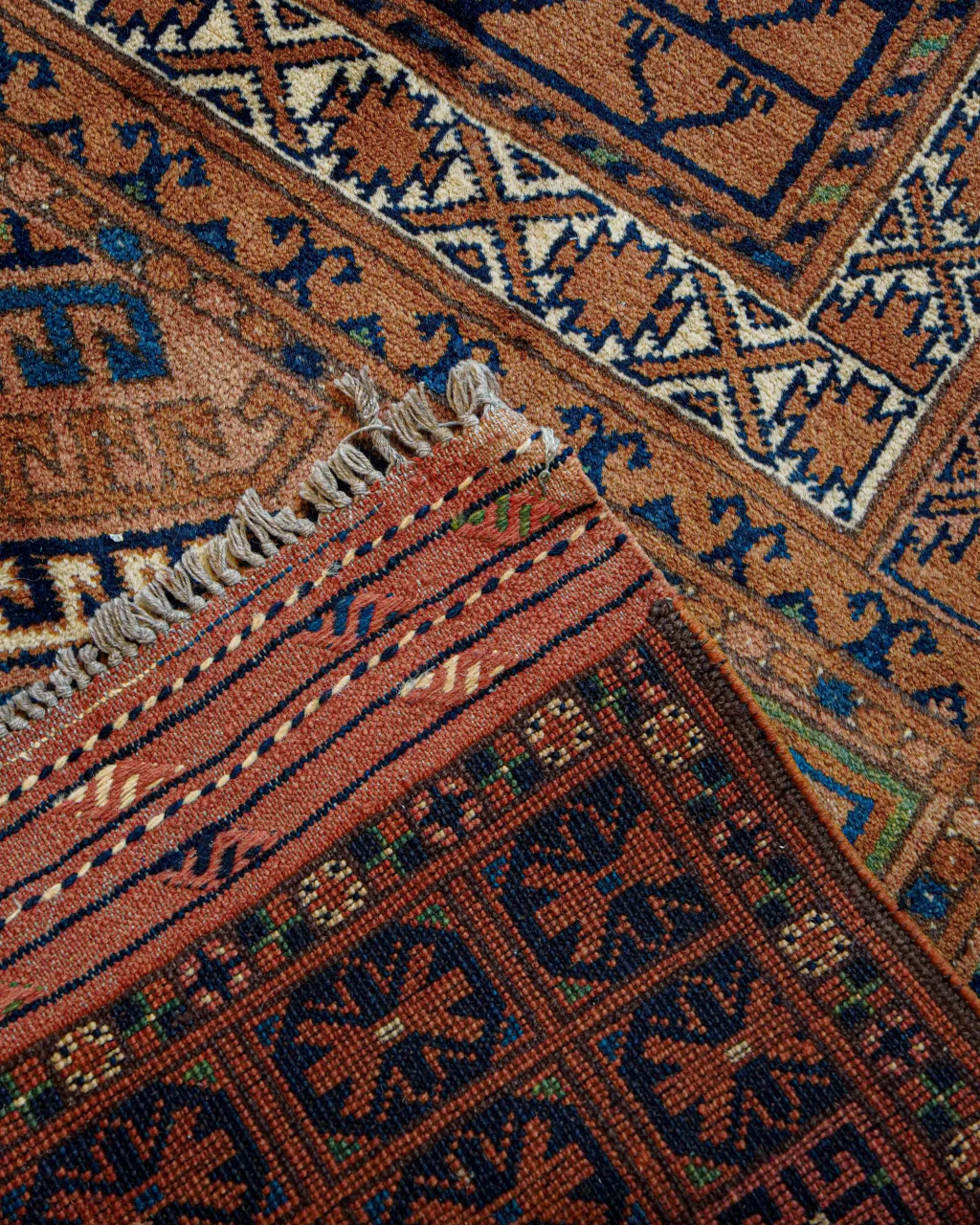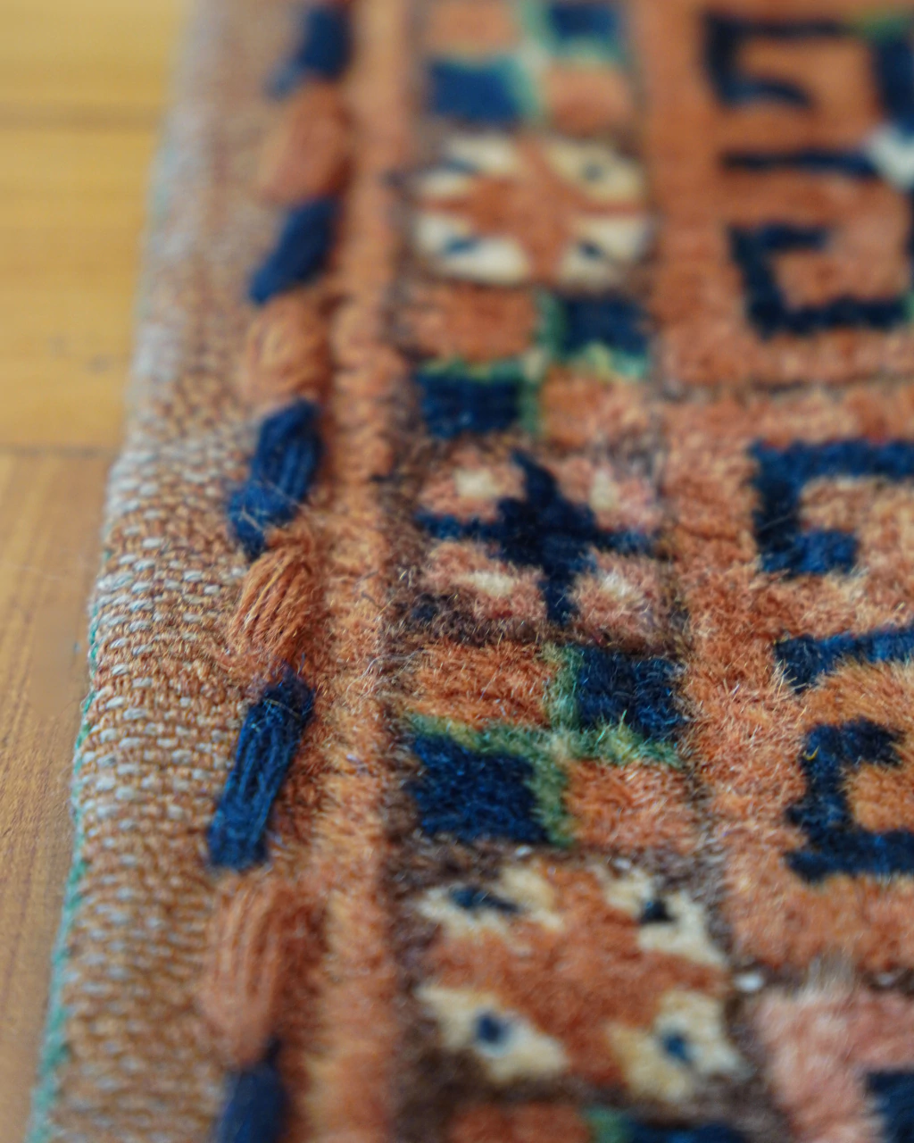 Outro detalhe especial está no acabamento: de um lado, a franja larga e bordada, característica marcante dos tapetes turcomenos; do outro, um acabamento tecido sem franja, apenas com um bordado decorativo na extremidade, exatamente como é tradicional entre os Yomud. Essas escolhas revelam autenticidade e reforçam o caráter artesanal da peça.